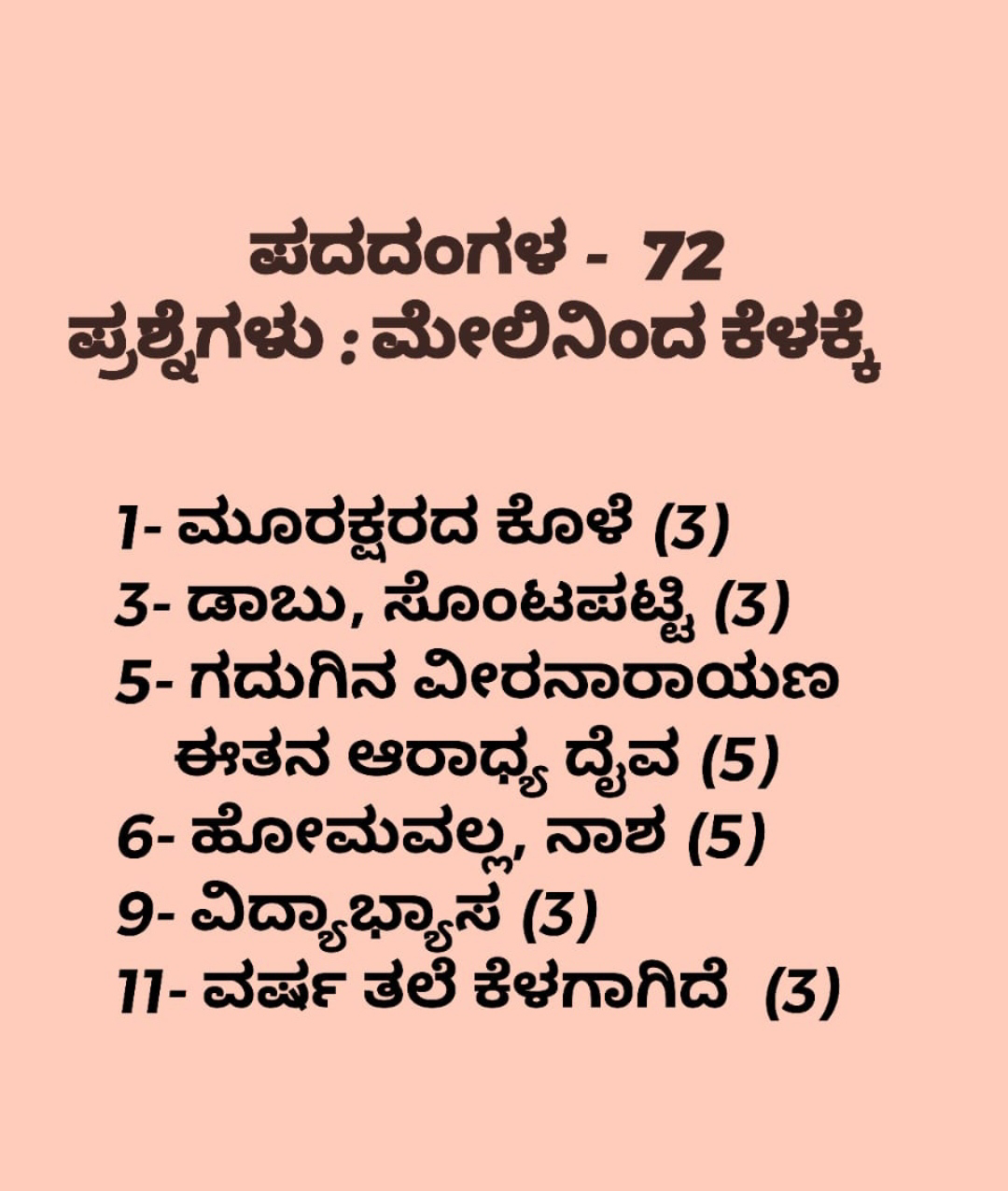 ಪದದಂಗಳ - 72ರ ಸರಿ ಉತ್ತರ ಈ ಕೆಳಗೆ ನೀಡಲಾಗಿದೆ